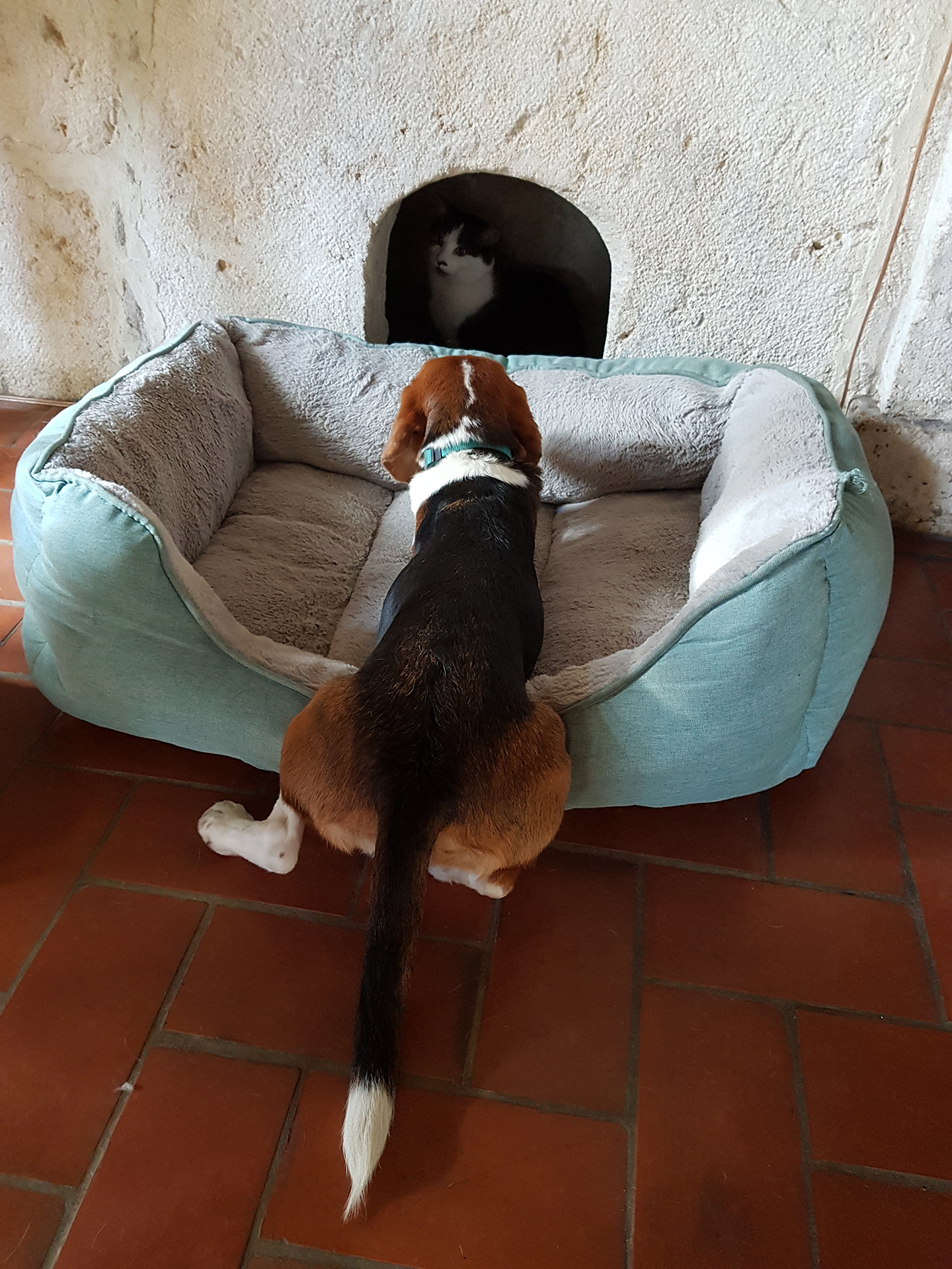 On a donc séparé la maison en deux, le bas pour Kali et l’étage comme base de repli pour les chats.