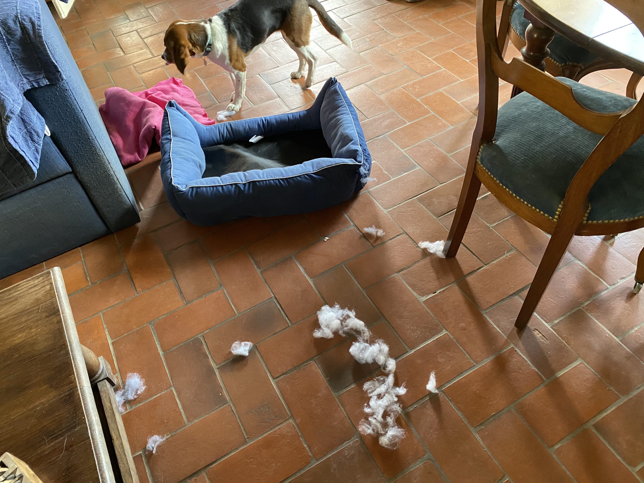 Rien ne lui échappe, avec une petite préférence pour l’extraction du kapok contenu dans les coussins. De mon côté, j’ai également dit adieu à mon tapis.